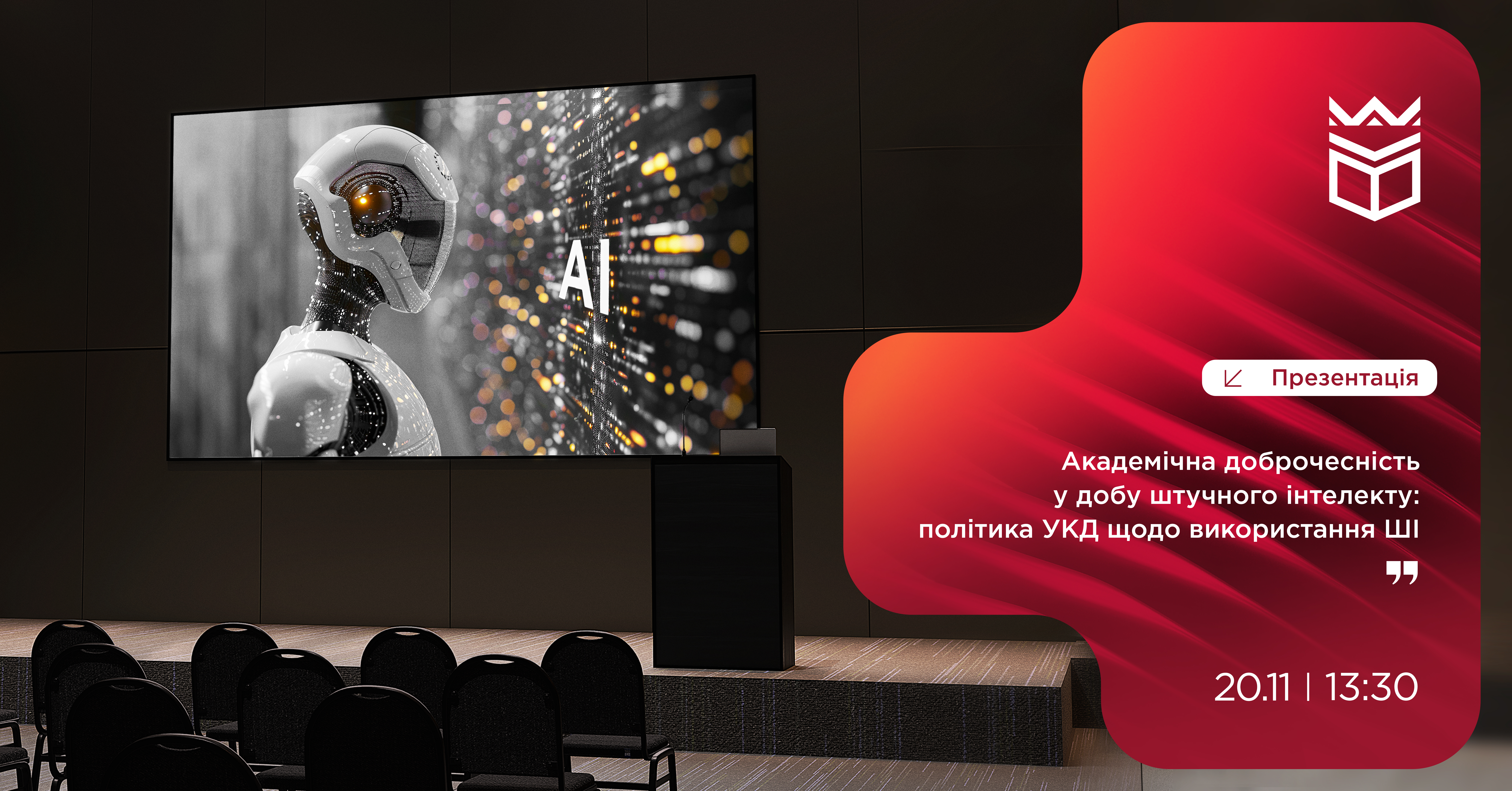 20 листопада о 13:30 у зал на 4 поверсі відбудеться презентація політики використання ШІ в УКД, а також популяризації принципів доброчесності в умовах ШІ. Запрошуємо долучитися до зустрічі викладачів, старост академічних груп та охочих студентів.