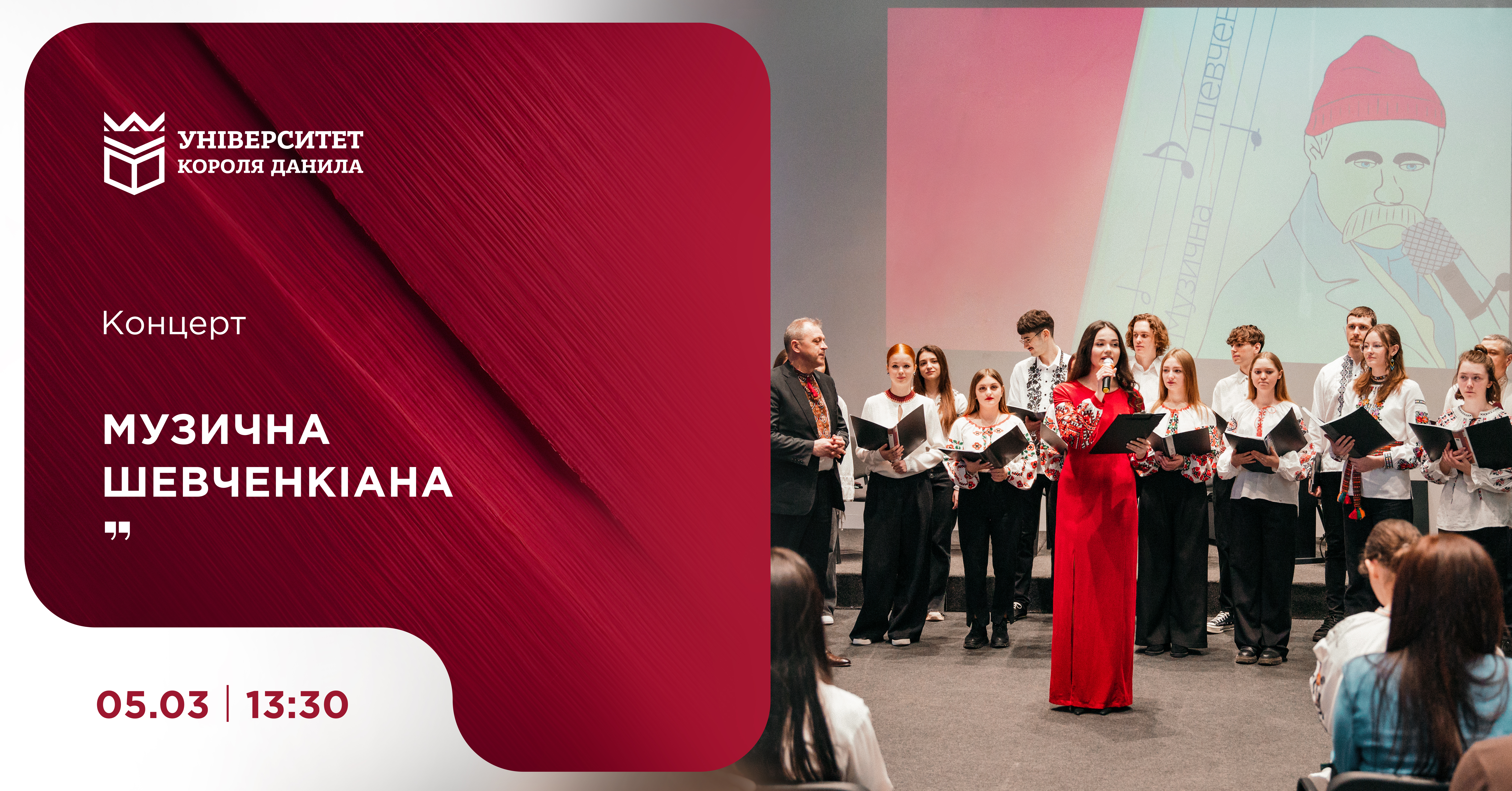 У концерті, приуроченому 212-й річниці від дня народження духовного пророка української нації Тараса Шевченка, візьмуть участь викладачі і студенти Фахового коледжу УКД та Університету Короля Данила спеціальності «Музичне мистецтво», які представлять поетичну спадщину Кобзаря в різних жанрах: вокальному, хоровому, інструментальному.