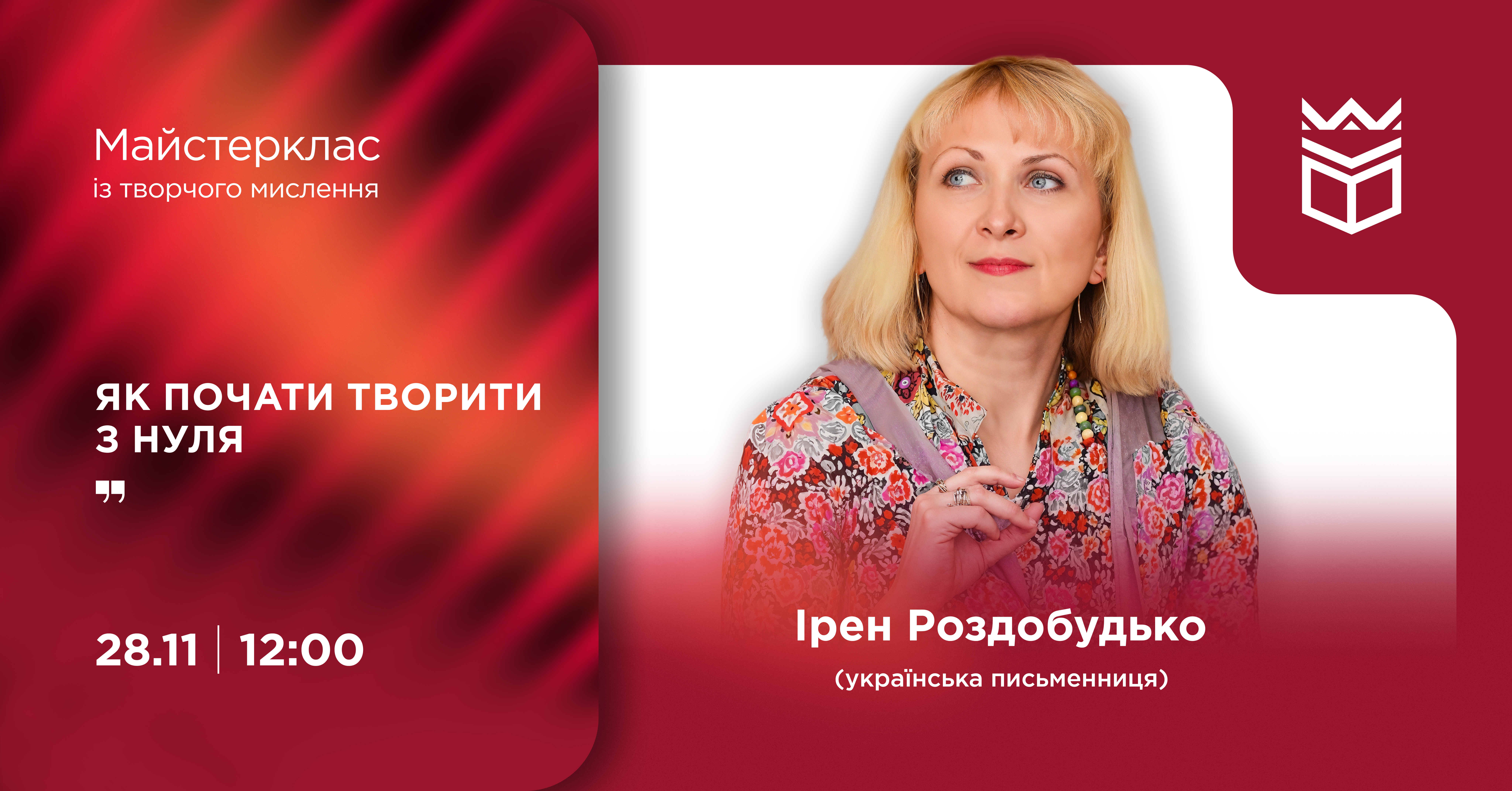 28 листопада о 12:00 в конференц-залі на 4 поверсі УКД відбудеться майстерклас із творчого мислення від Ірен Роздобудько «Як почати творити з нуля».