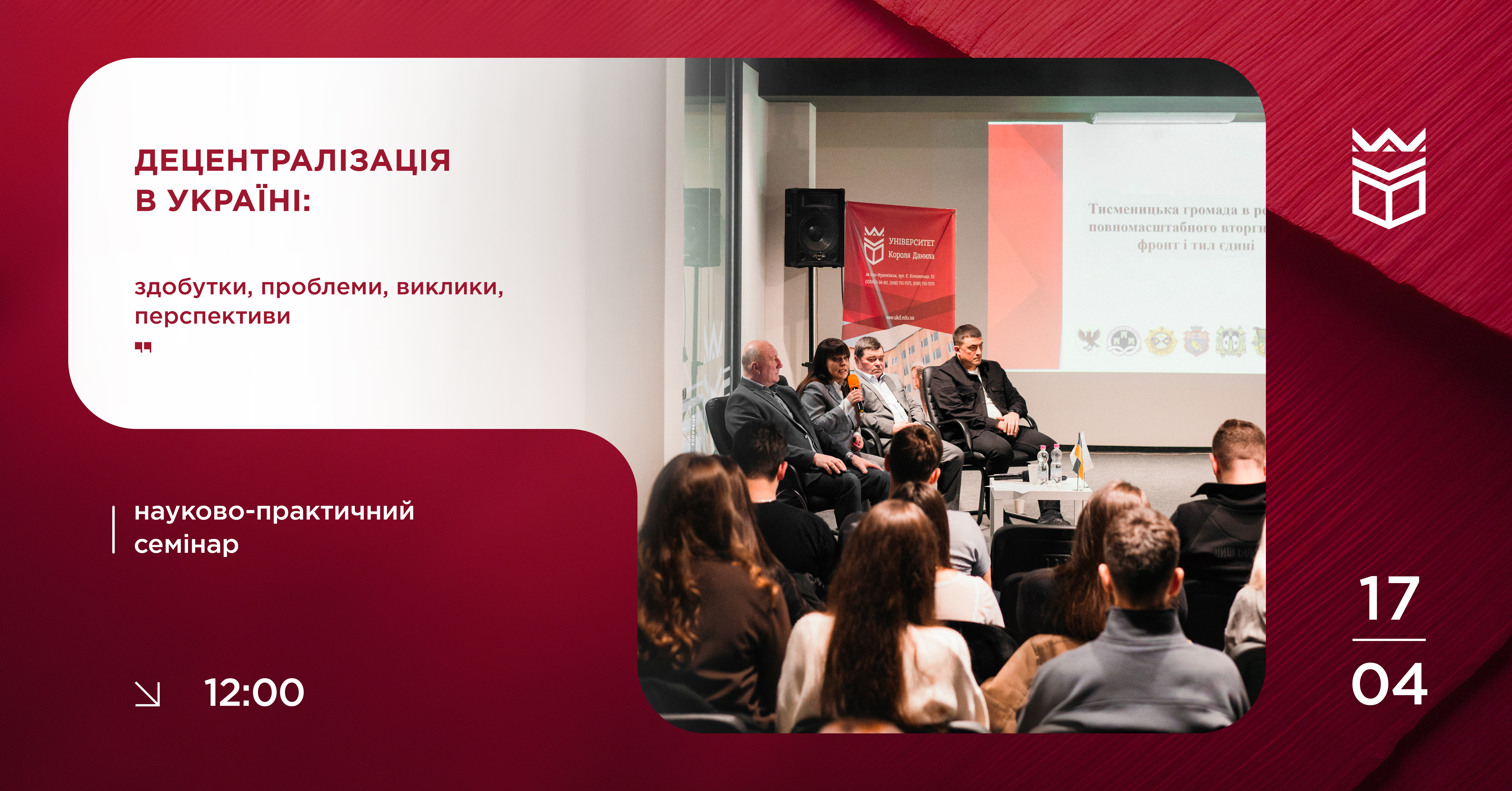 17 квітня о 12:00 у конференц-залі на 4 поверсі Університету Короля Данила відбудеться науково-практичний семінар «Децентралізація в Україні: здобутки, проблеми, виклики, перспективи».