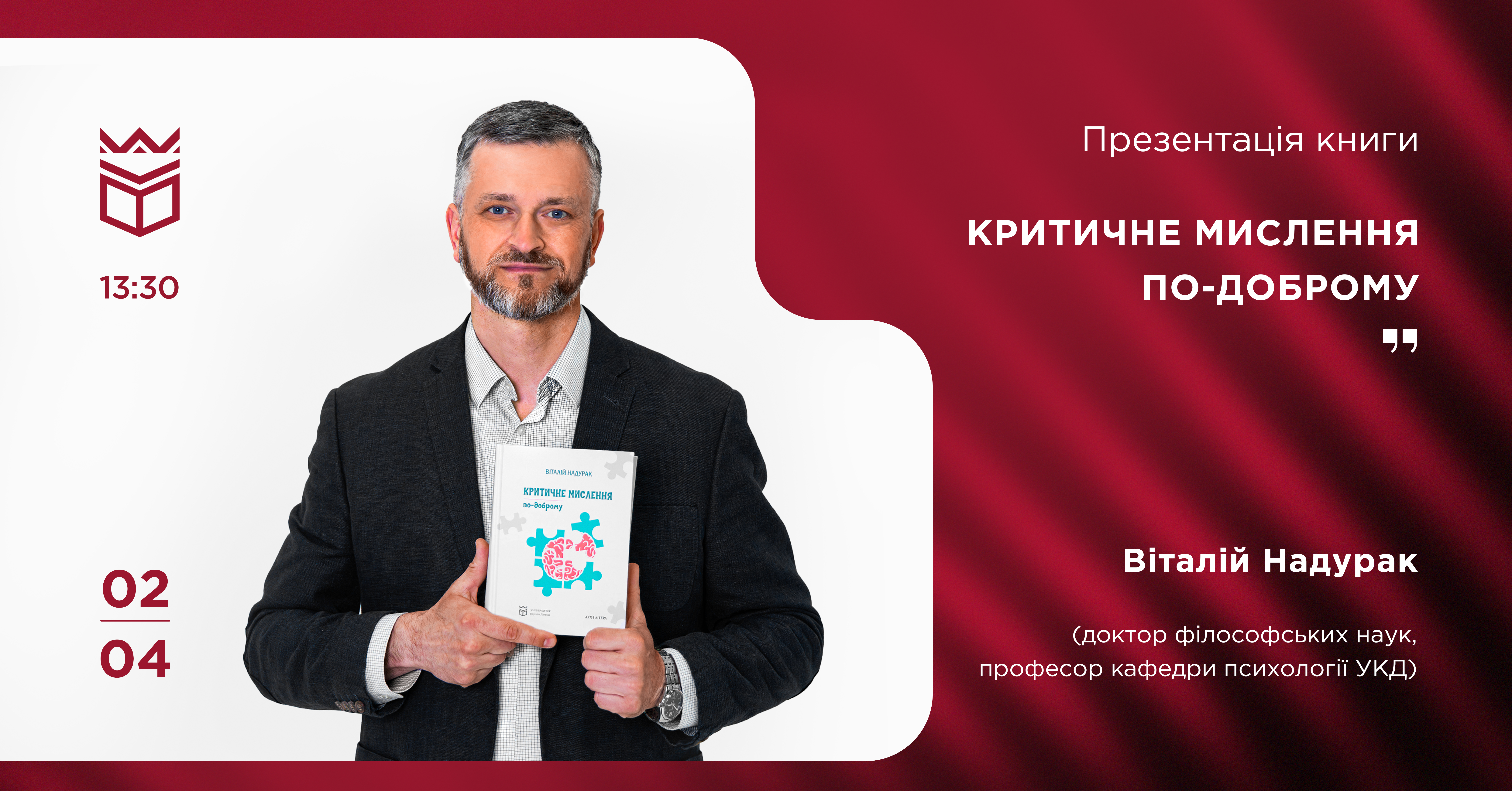 2 квітня о 13:30 в конференц-залі на 4 поверсі УКД відбудеться презентація книги «Критичне мислення по-доброму» професора УКД Віталія Надурака.