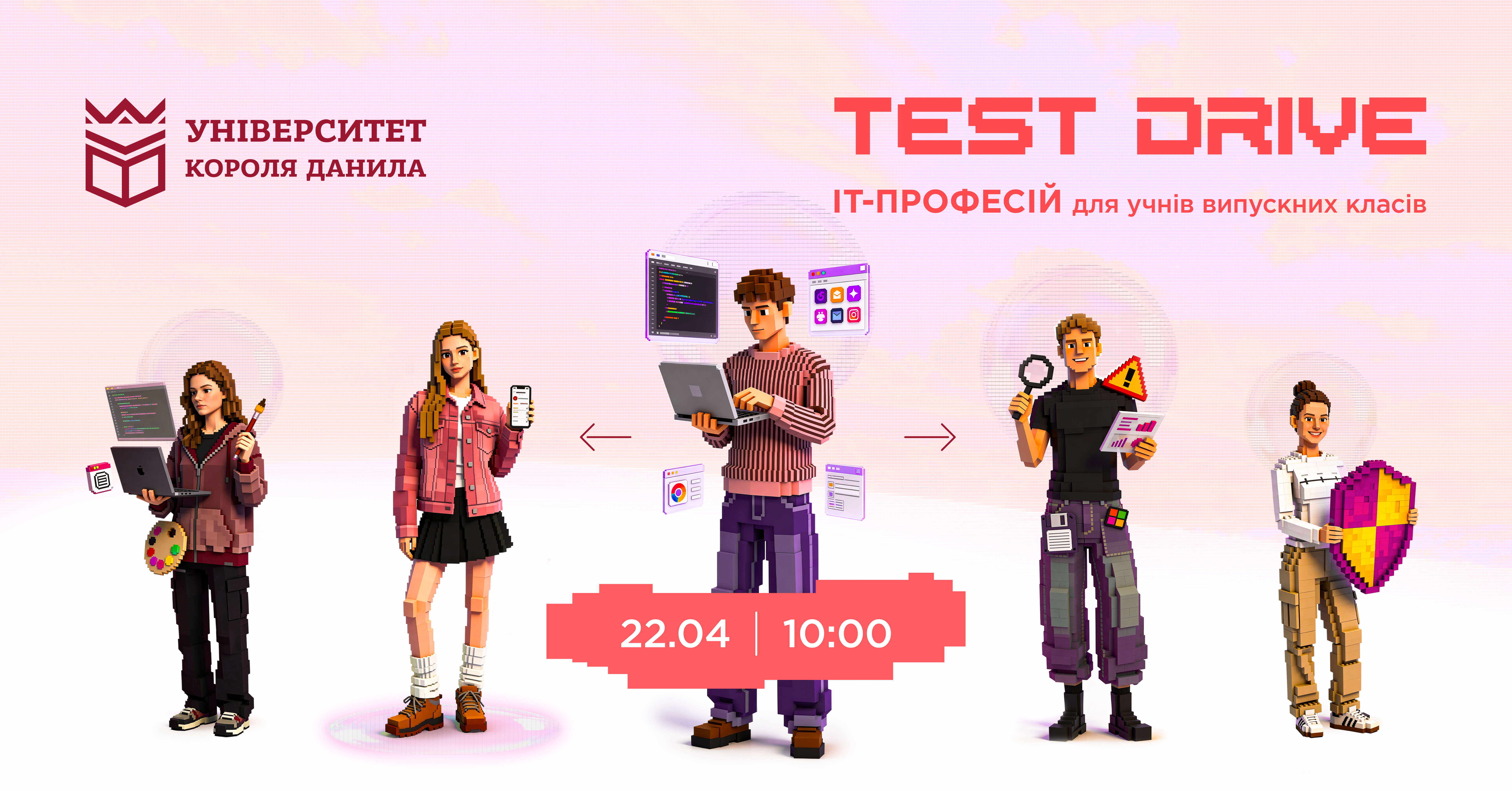 22 квітня о 10:00 у великому актовому залі Університету Короля Данила відбудеться захід для учнів 9 та 11 класів «TEST DRIVE ІТ-професій».