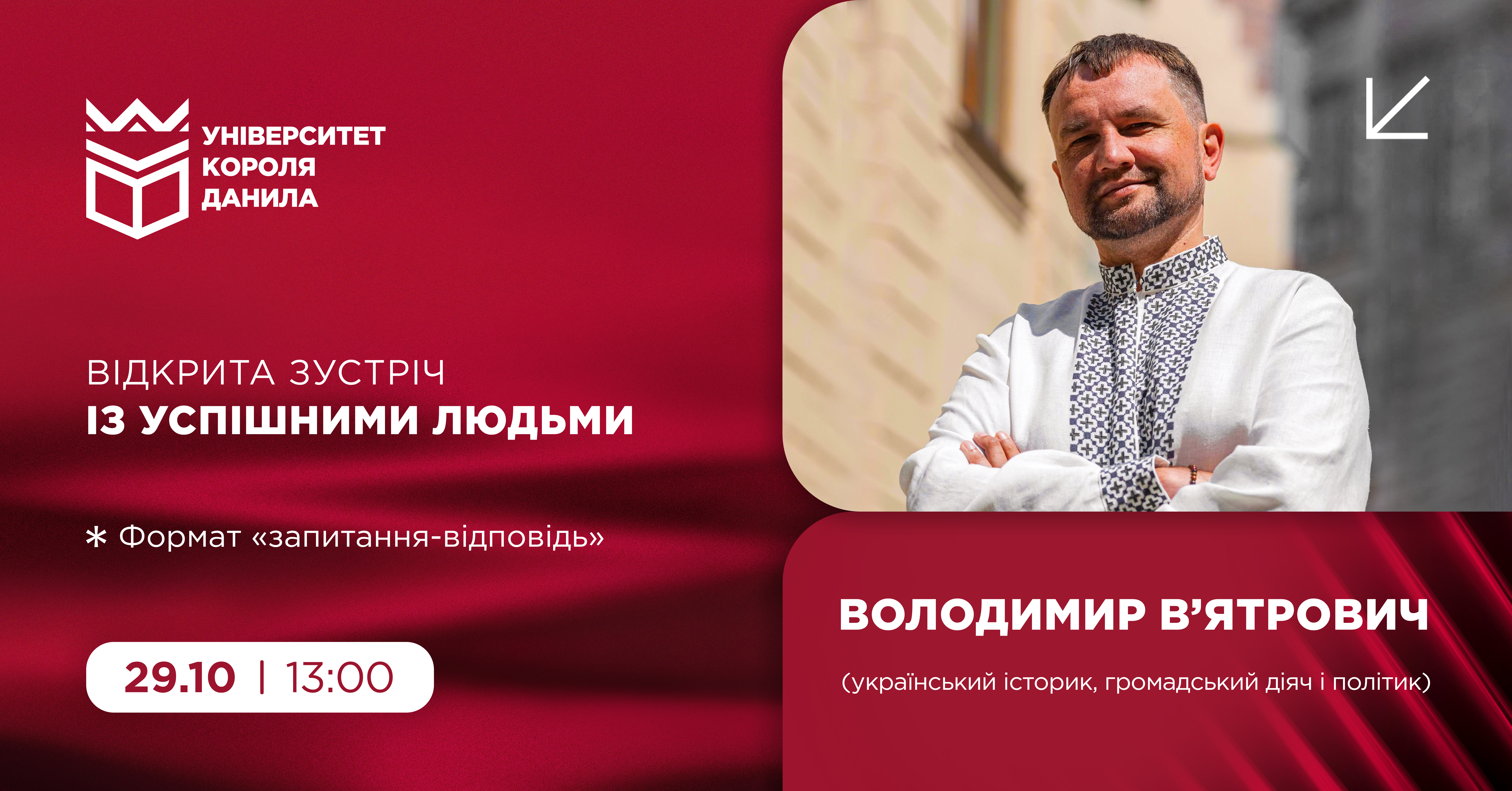 29 жовтня о 13:00 у великій актовій залі УКД відбудеться зустріч із Володимиром Вʼятровичем. Тема зустрічі «Генерал Василь Кук як успішний українець».