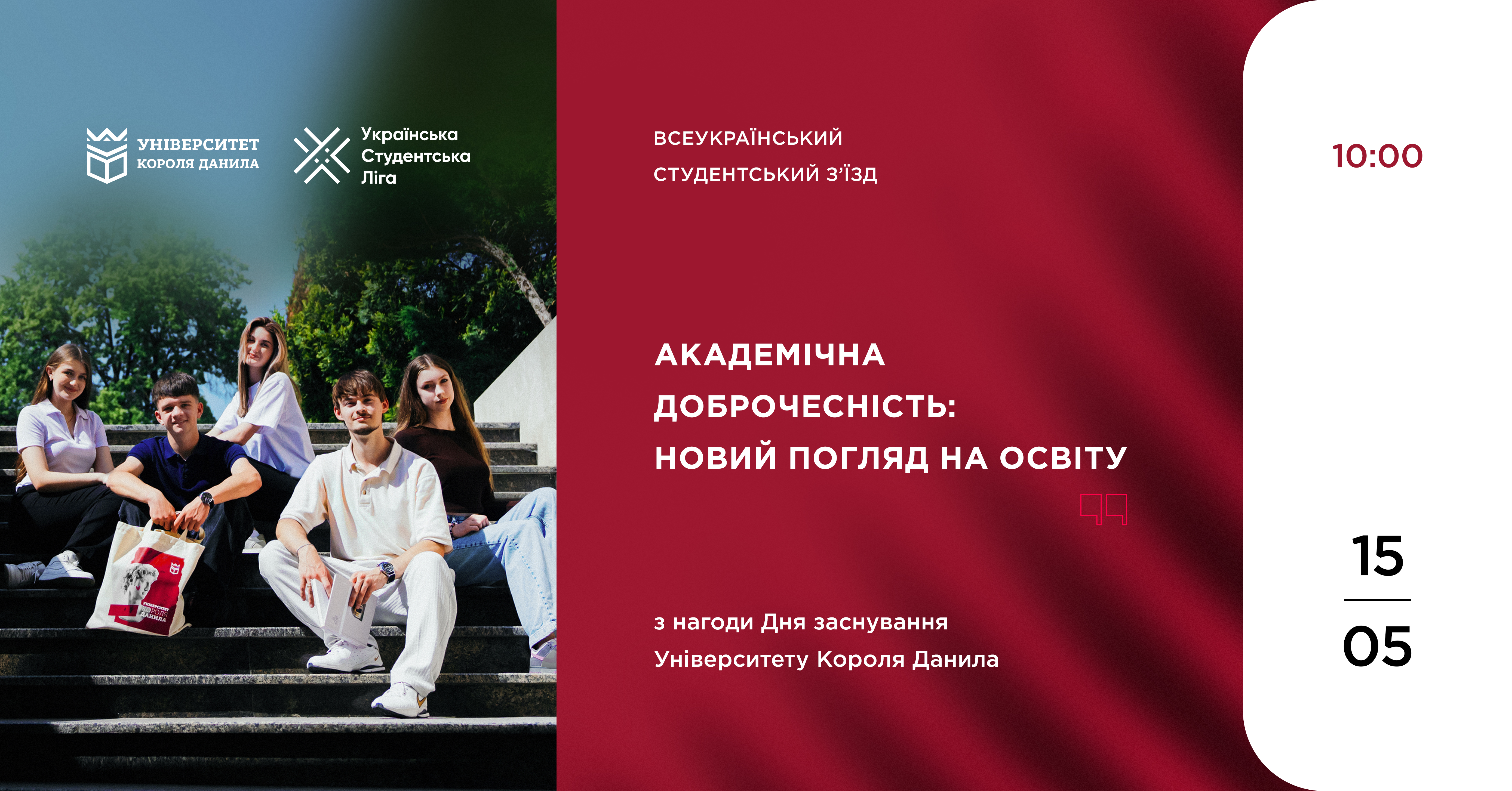 З нагоди Дня заснування Університету Короля Данила 15 травня о 10:00 у великому актовому залі УКД відбудеться Всеукраїнський студентський з’їзд «Академічна доброчесність: новий погляд на освіту». Захід організовується Університетом Короля Данила спільно з Українською Студентською Лігою.