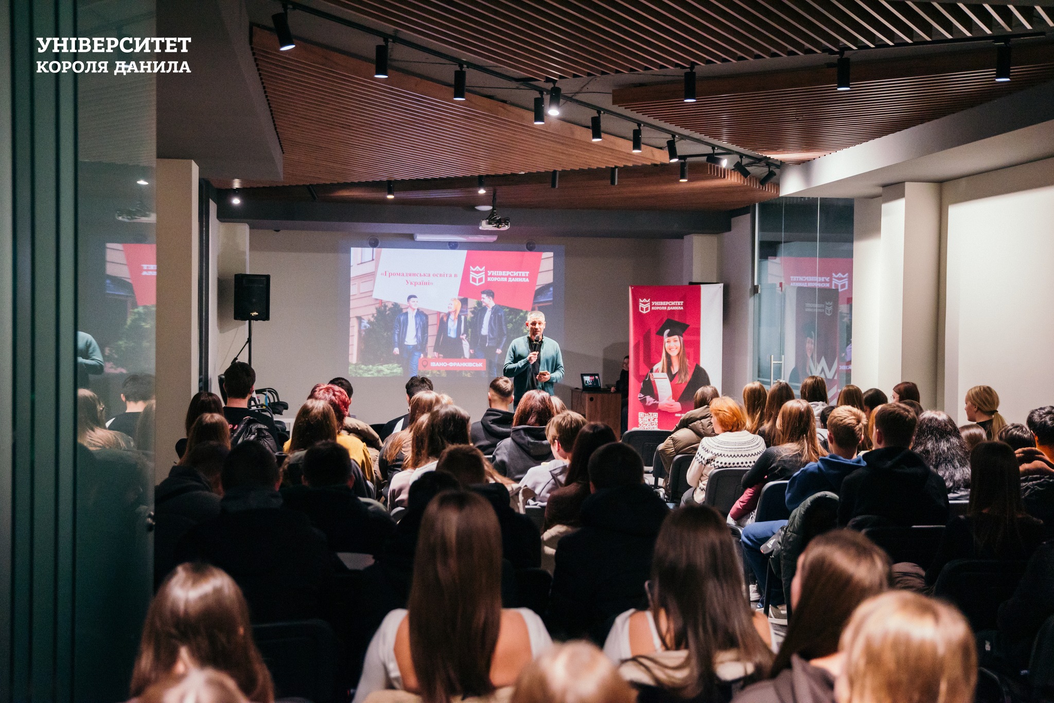 Традиційно заступник проректора із соціальної та профорієнтаційної роботи УКД Роман Матлюк провів опитування про громадянську освіту в Україні. Також розповів про освітні можливості, які пропонує для абітурієнтів УКД.