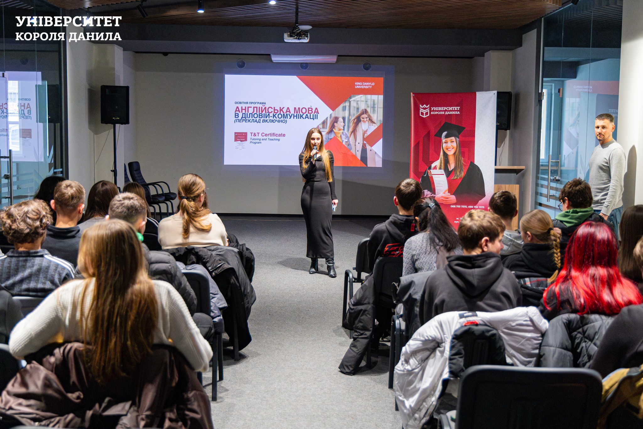 Викладачка кафедри іноземної філології та бізнес-комунікацій УКД Аліна Душкевич презентувала спеціальність «Філологія» (ОП «Англійська мова в діловій комунікації (переклад включно)»).