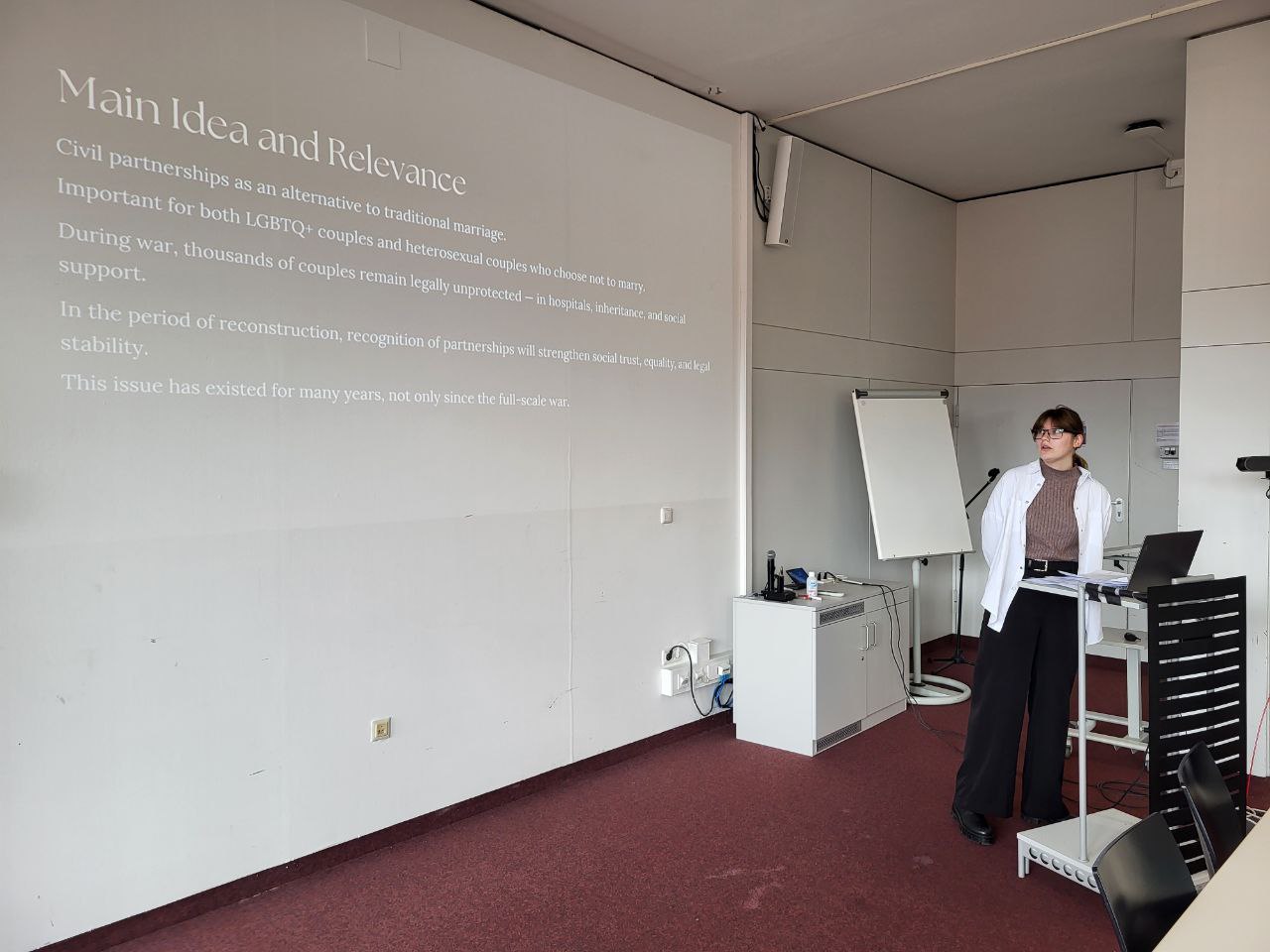 До складу делегації увійшли молоді науковці, здобувачі першого (бакалаврського) та другого (магістерського) рівнів освіти, які навчаються в Університеті Короля Данила за спеціальністю «Право». Вони представили іншим учасникам такі наукові розвідки: «Післявоєнні демократичні вибори» (Юрій Човган), «Розбудова доброчесності: антикорупційні заходи на шляху до вступу до ЄС» (Дмитро Дронь), «Роль цивільних партнерств у захисті прав людини під час війни та відбудови» (Софія Флісак), «Судова реформа: перспективи цифровізації судових проваджень та доступу до правосуддя» (Олег Човган), «Реформа правосуддя та заходи протидії сексуальному насильству, пов’язаному з конфліктом в Україні» (Дарія Сидор).