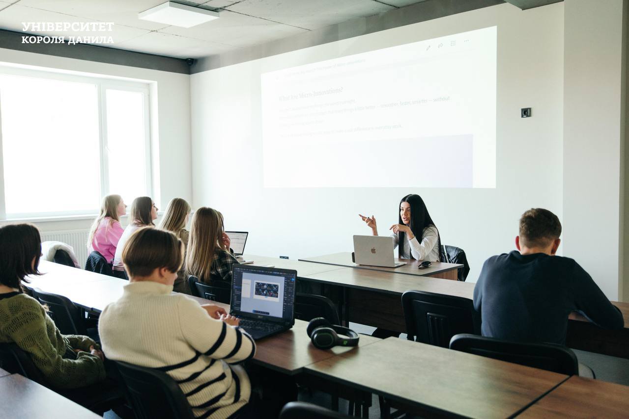 На парі з курсу «Креативне управлінське мислення» у групах Мнс-23-1, ПТс-23-1 відбулася цікава дискусія англійською мовою на тему «Small steps, big impact: the power of micro-innovations» з Марією Марків.