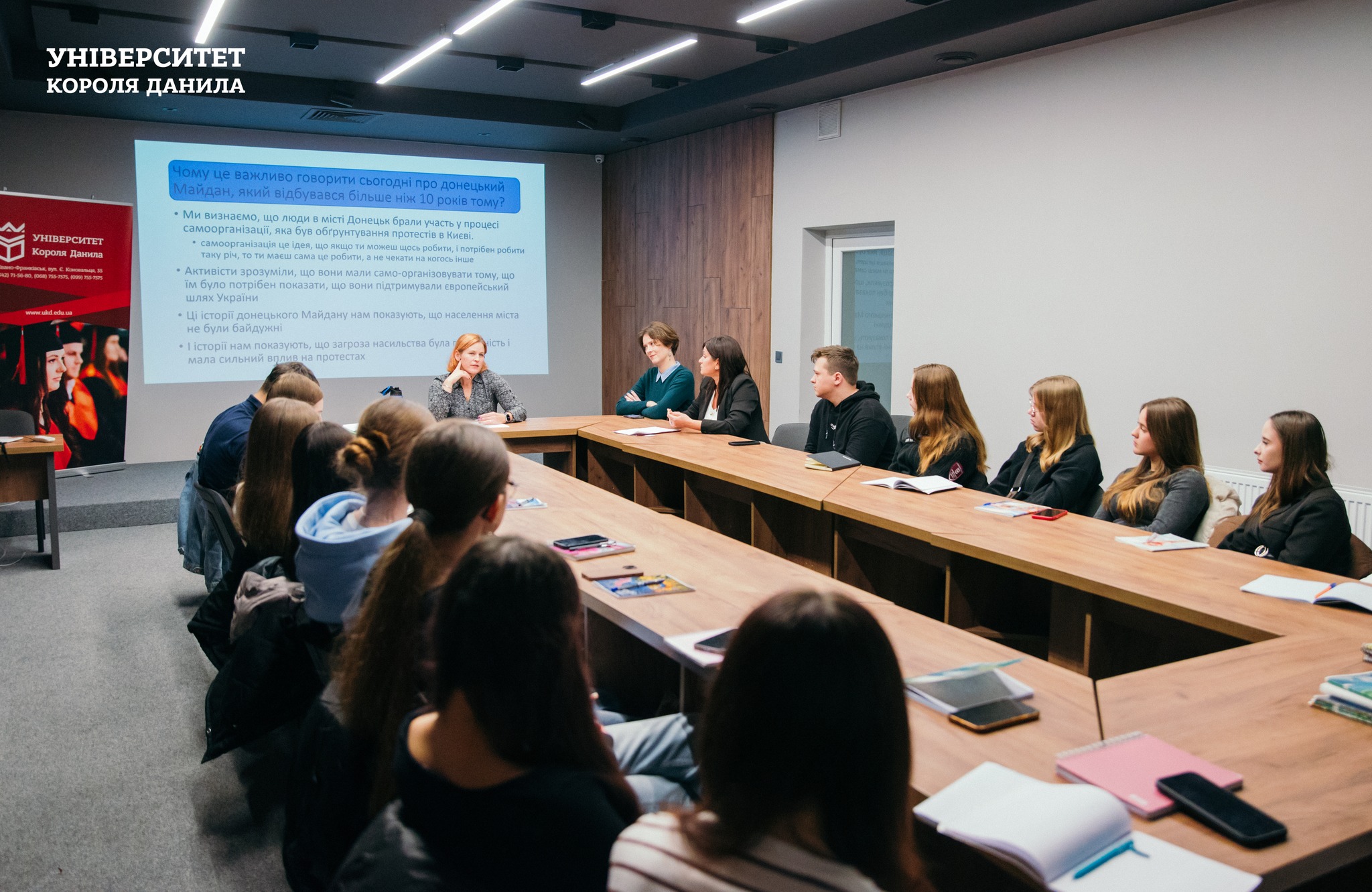 Соціокультурна антропологиня та директорка Temerty Contemporary Ukraine Program в Українському науковому інституті Гарвардського університету Емілі Ченнел-Джастіс прочитала для студентів Університету Короля Данила лекцію «Донецький Євромайдан і феномен самоорганізації в Україні».