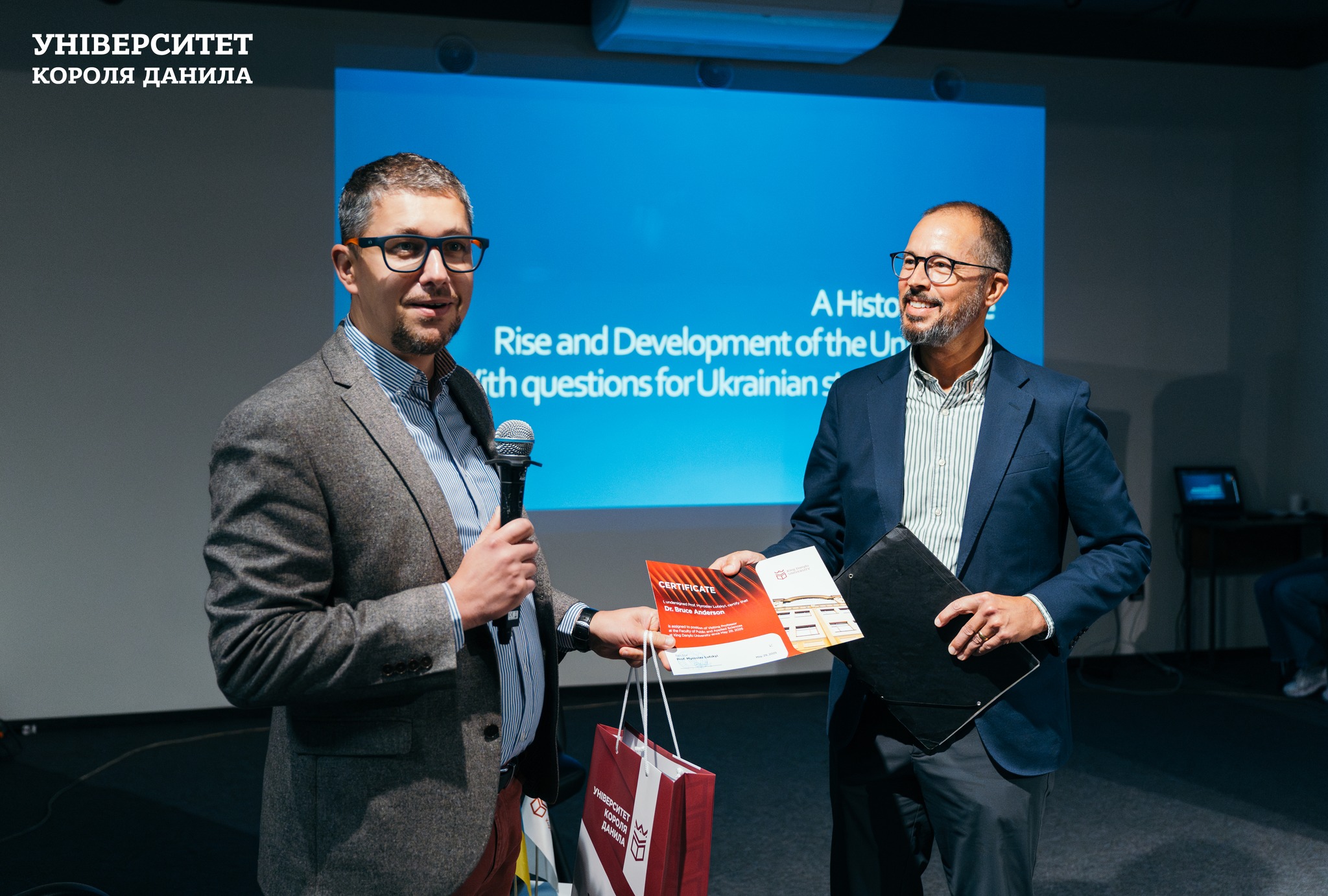 Проректор із міжнародних зв’язків та стратегічного розвитку УКД Максим Карпаш (Maksym  Karpash) вручив Брюсові Андерсону сертифікат, який засвідчує, що відтепер він є гостьовим професором Університету Короля Данила. 1 жовтня він прочитає для студентів ще одну лекцію, присвячену практичним навичкам навчання у класичній традиції