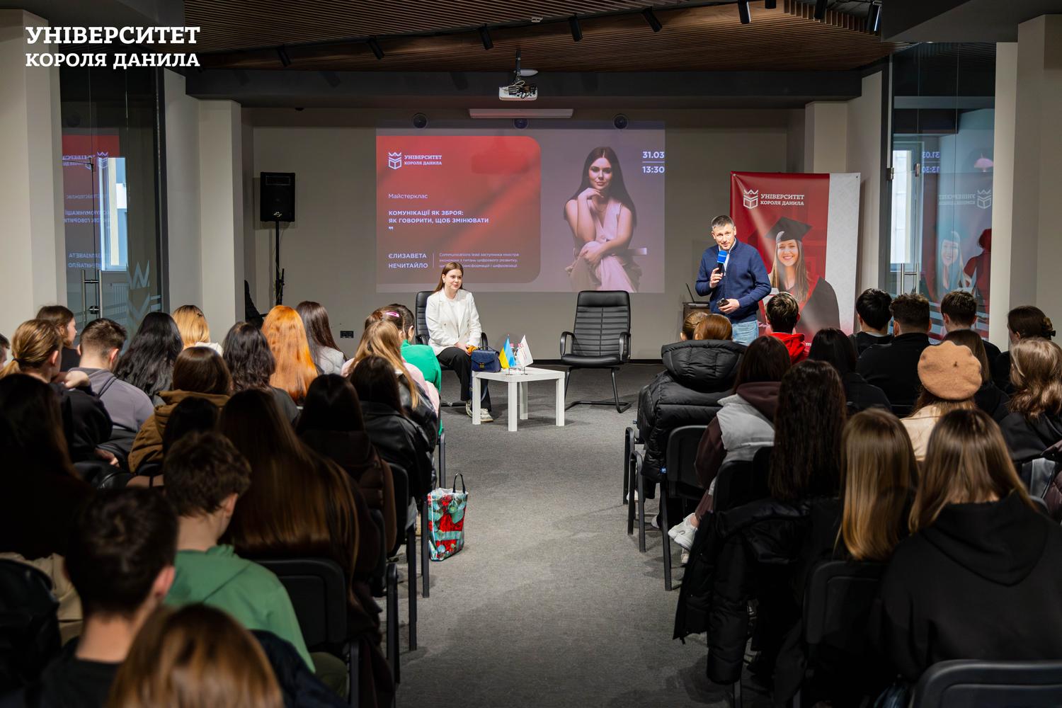 31 березня в Університеті Короля Данила Communications lead заступника міністра економіки з питань цифровізації Єлизавета Нечитайло провела майстерклас «Комунікації як зброя: як говорити, щоб змінювати».